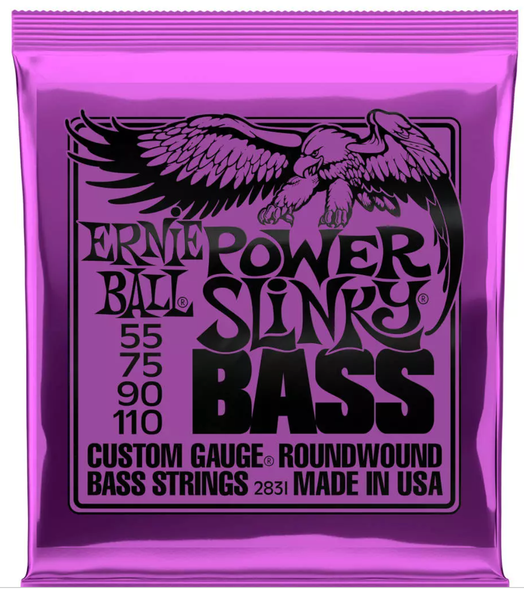 Ernie Ball Power Slinky Bass sets are wound for a bright, balanced tone. Each bass string is manufactured with the finest and freshest raw materials in the beautiful Coachella Valley of Southern California. The list of endorsers for Ernie Ball Slinky bass strings reads like a who's who of top selling artists. Gauges .055, .075, .090, .110