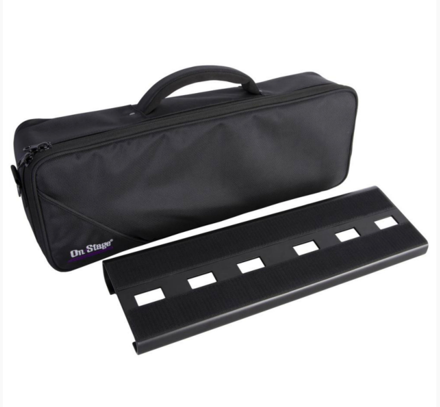 Our GPB2000 Compact Pedalboard enables efficient, prewired set up and transportation for multiple effect pedals. The pedalboard securely holds up to five standard-size pedals and is angled toward a guitarist for comfortable viewing and operation. The pedal platform is conveniently slotted for tidy cable arrangement. Nonslip rubber feet keep gear safely in place on the floor. Plenty of adhesive hook-and-loop strips are included to cover the platform and pedals for proper mounting. For ease of carrying, the pedalboard also comes with a protective padded gig bag that features a removable shoulder strap and a top handle. The bag's internal accessories pocket provides convenient access to supplies and tools.