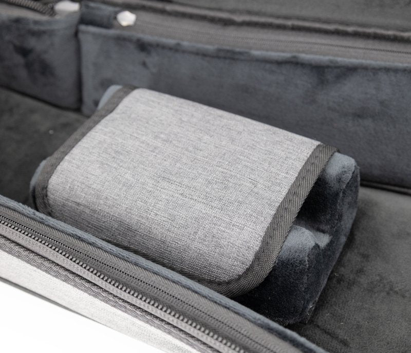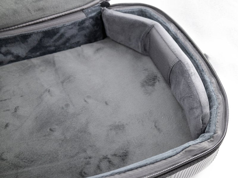 - Plush velveteen interior with padded adjustable base and padded adjustable and securable neck support